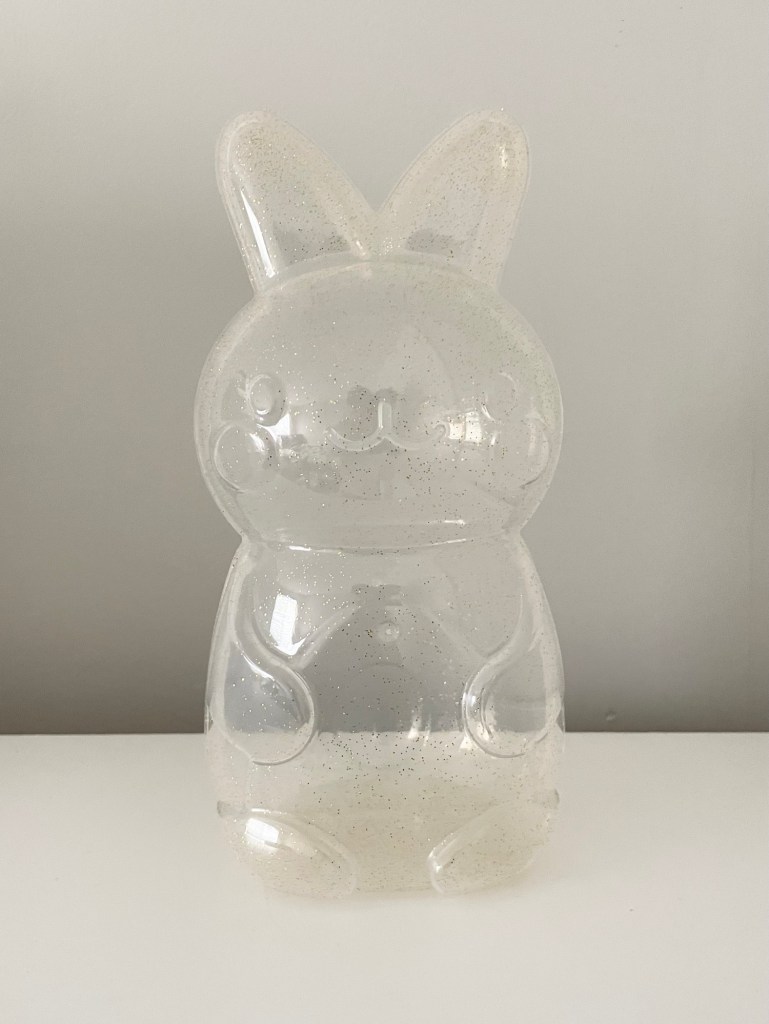 although I have white baskets from last year, I found these cute plastic bunny containers in bullseye’s playground at target, and it is absolutely adorable. the containers are fillable and a good size, plus I love the clear glitter color.