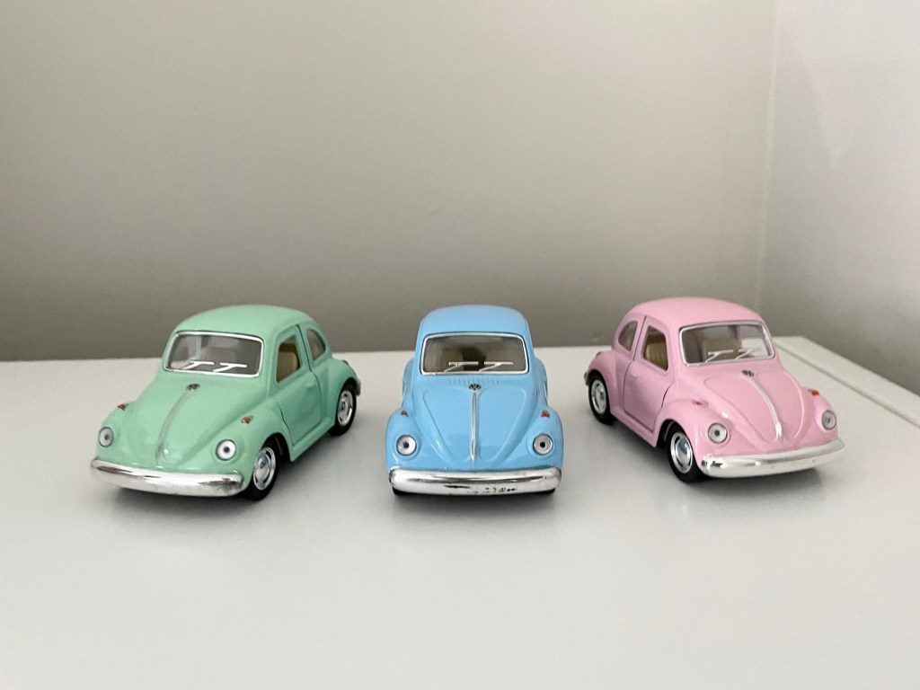 the highlight of my hunting are these volkswagen beetle cars. I found these pastel colored beauties in the seasonal section of my local wegmans grocery store, and linked something similar. how adorably spring are the colors. I got one for each basket!