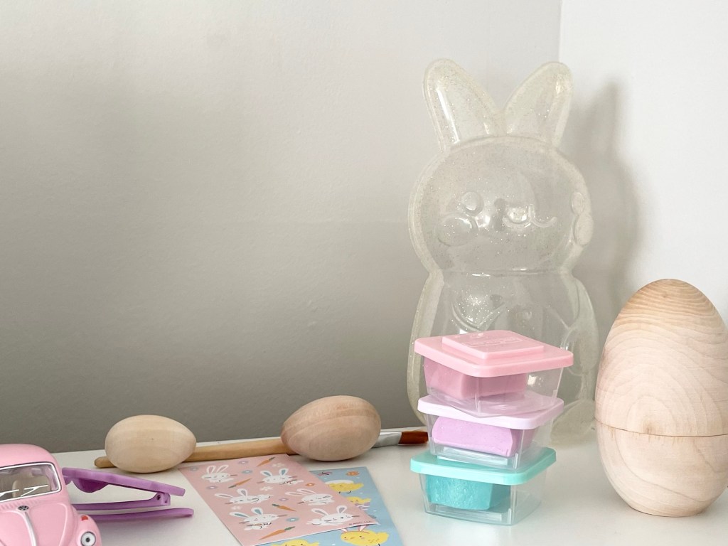 the fillable bunny holds: the car, some wooden eggs, a paint brush, a play dough pack I split between the kids, the sunglasses as well as some stickers.