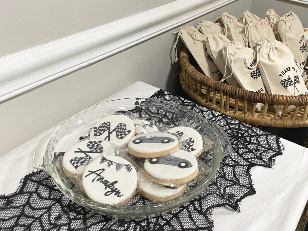 the custom cookies were the real stars of our desserts. our custom favor bags said, “thanks for racing by!” and it still makes me giggle. the small details really tie in the theme of the party and the personalization makes it special.