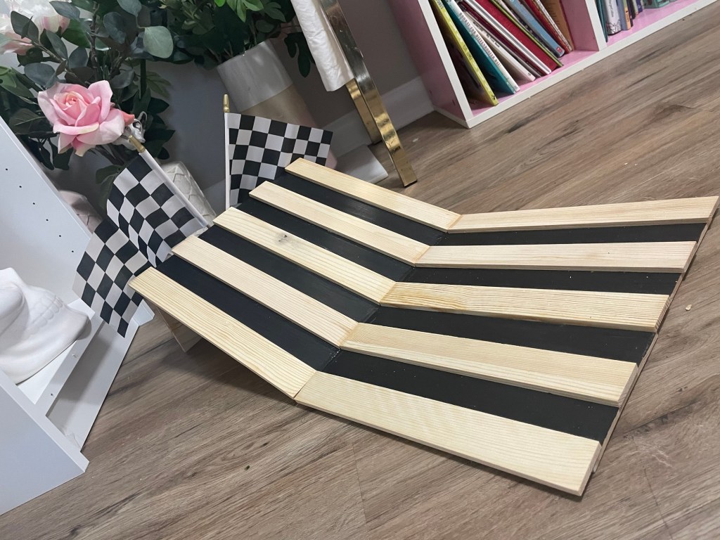 this was the highlight piece of the decor! very proud of this creation right here, I craft it using wood glue, pine craft wood and a lot of drying time with big books as I didn’t have clamps. this ramp is the perfect size for hot wheels cars to fly down.